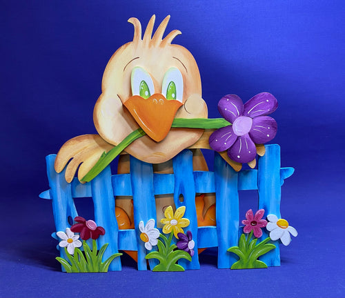 Gockel mit Blume im Schnabel als Standfigur aus Holz